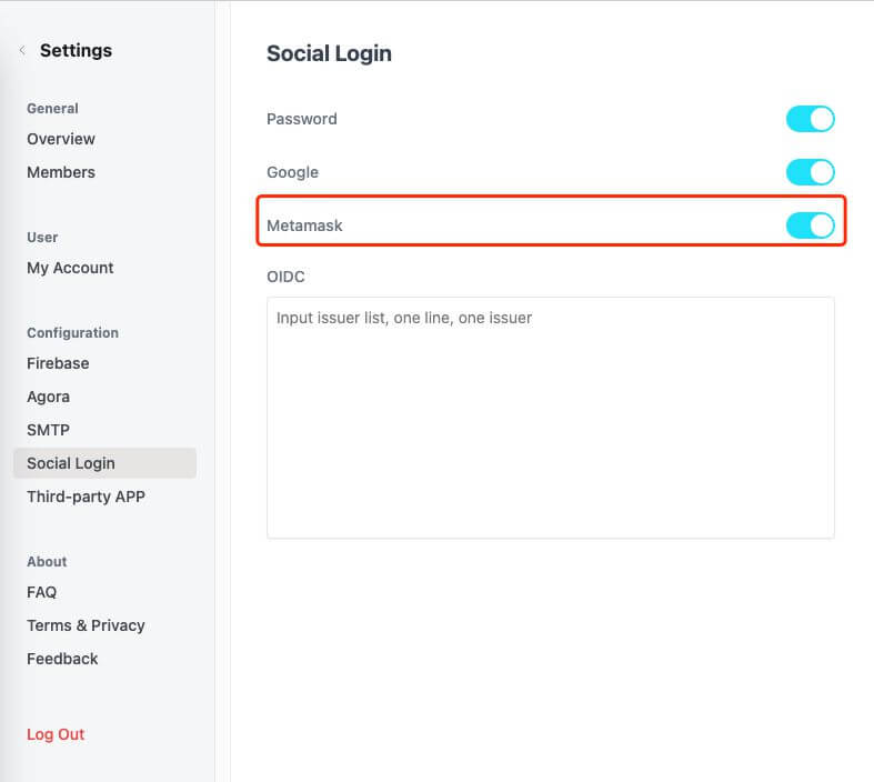 1. Vocechat administrator logs in to the background, and enables the metamask login (no setup required):